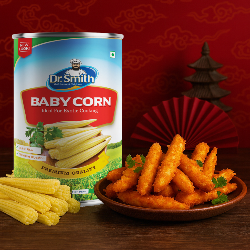 Enjoy the finest baby corn in India with Dr. Smith. Tender, crisp, and naturally sweet, these bite-sized corns are carefully handpicked and preserved to keep their fresh crunch. Ideal for Indian kitchens, HoReCa, and international dishes, they bring amazing color, taste, and texture to stir-fries, soups, salads, and pizzas. Available in convenient 400 g and 800 g packs, they are perfect for home cooks and professional kitchens.